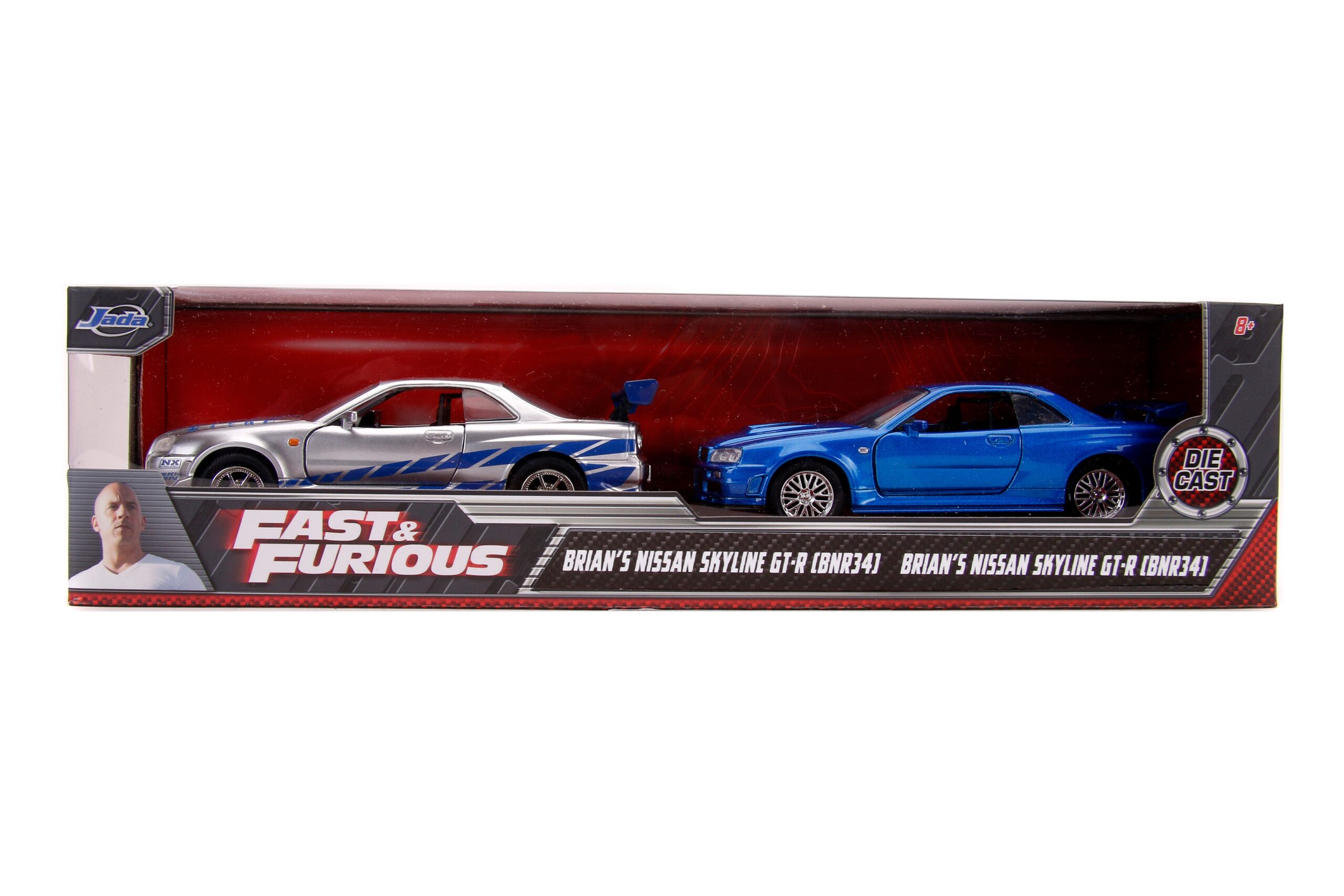 Ce coffret exclusif de Jada Toys met en avant la nissan skyline gt-r, un modèle emblématique de la saga Fast & Furious. Il comprend deux véhicules miniatures à l’échelle 1:32, reproduisant fidèlement la Nissan Skyline GT-R (R34) conduite par Brian O’Conner. Chaque voiture est fabriquée en métal moulé sous pression, garantissant robustesse et réalisme. Les finitions métallisées et les détails précis rendent hommage aux voitures originales vues dans les films.
